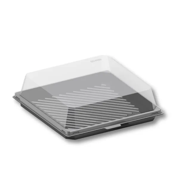 Чёрное основание создаёт элегантный контраст, который выгодно подчёркивает торт и придаёт ему люксовый вид. Полностью прозрачная крышка позволяет клиенту видеть продукт со всех сторон, что повышает привлекательность на витрине и облегчает выбор.