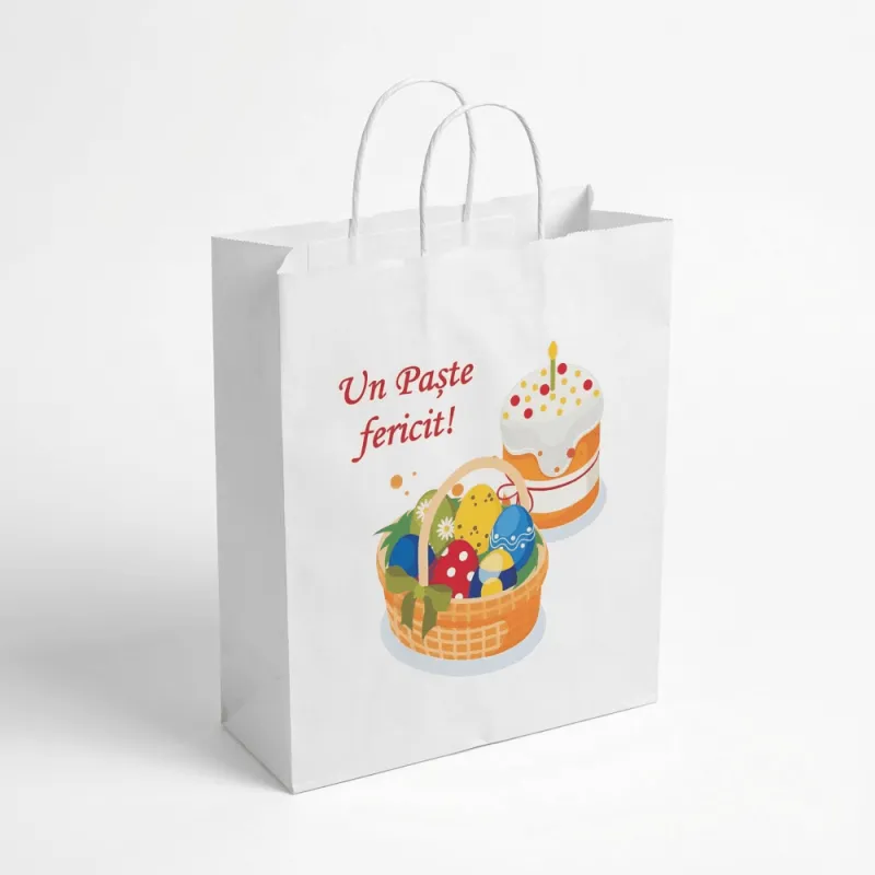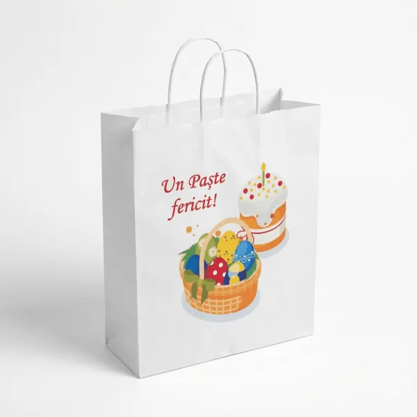 Бумажный пакет с кручеными ручками 30x15x40 см, белый, с пасхальным принтом «Paste fericit!»