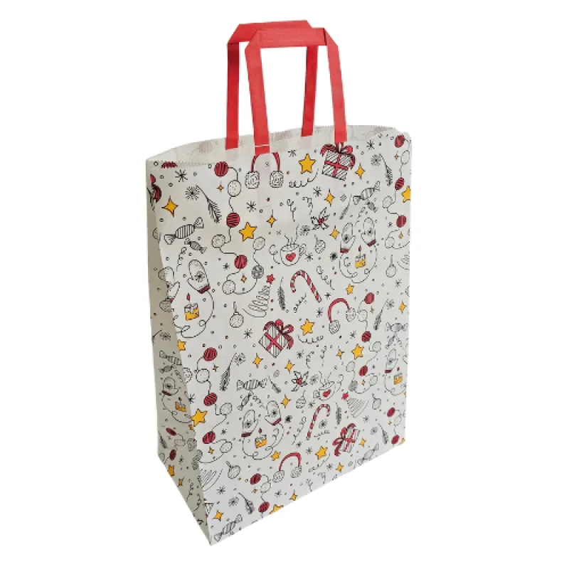 Новогодний бумажный пакет с плоскими красными ручками, 26х14х35 см
