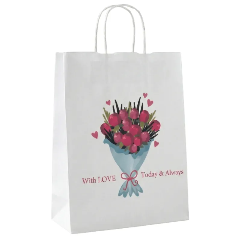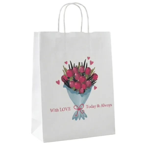 Punga hartie cadou cu maner rasucit 18x8x24 cm, alba cu buchet „With love”